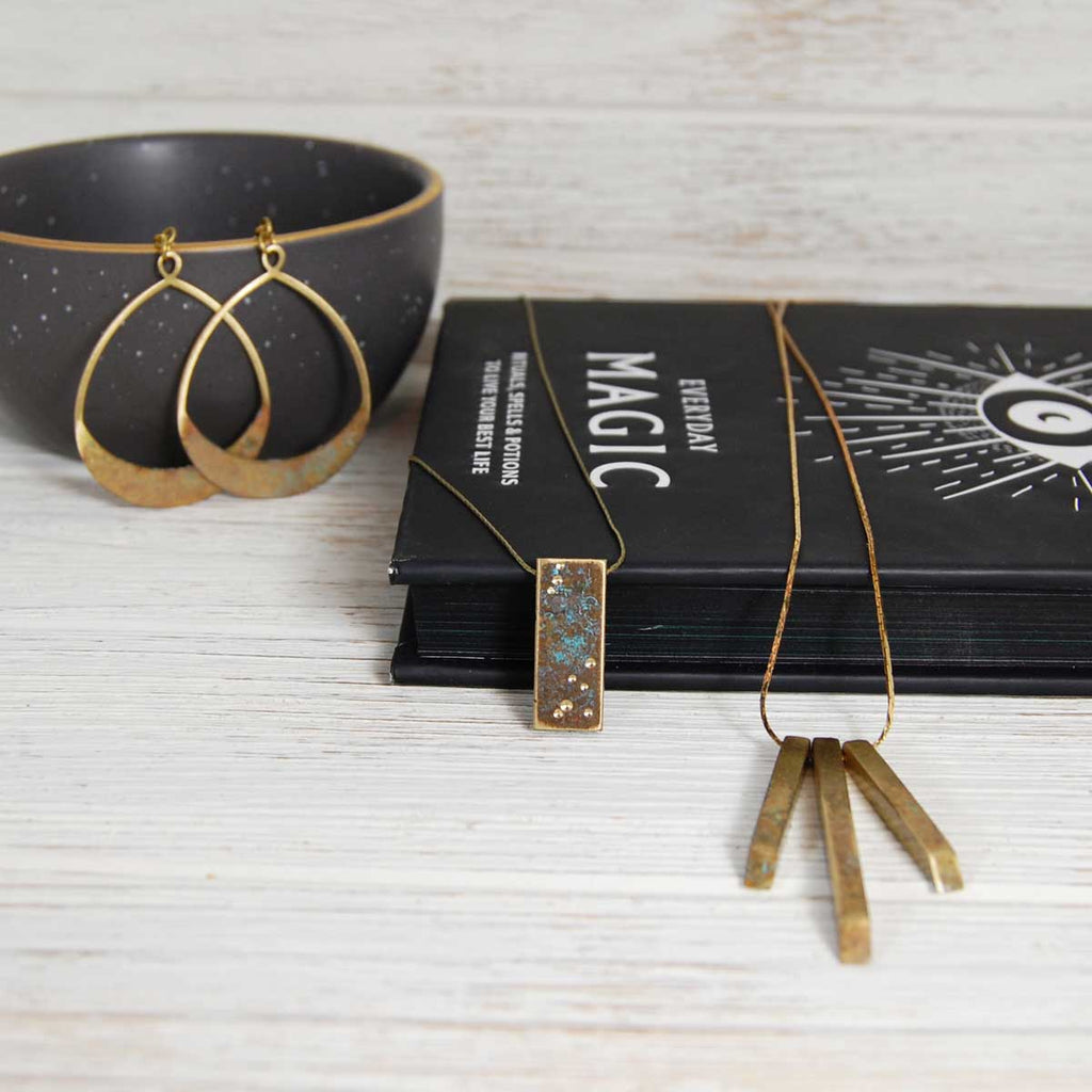 Mimi and Ferne handmade jewelry is inspired by nature, design, art deco architecture, and the beautiful transformation in color and texture that metal goes through over time when exposed to the elements.
